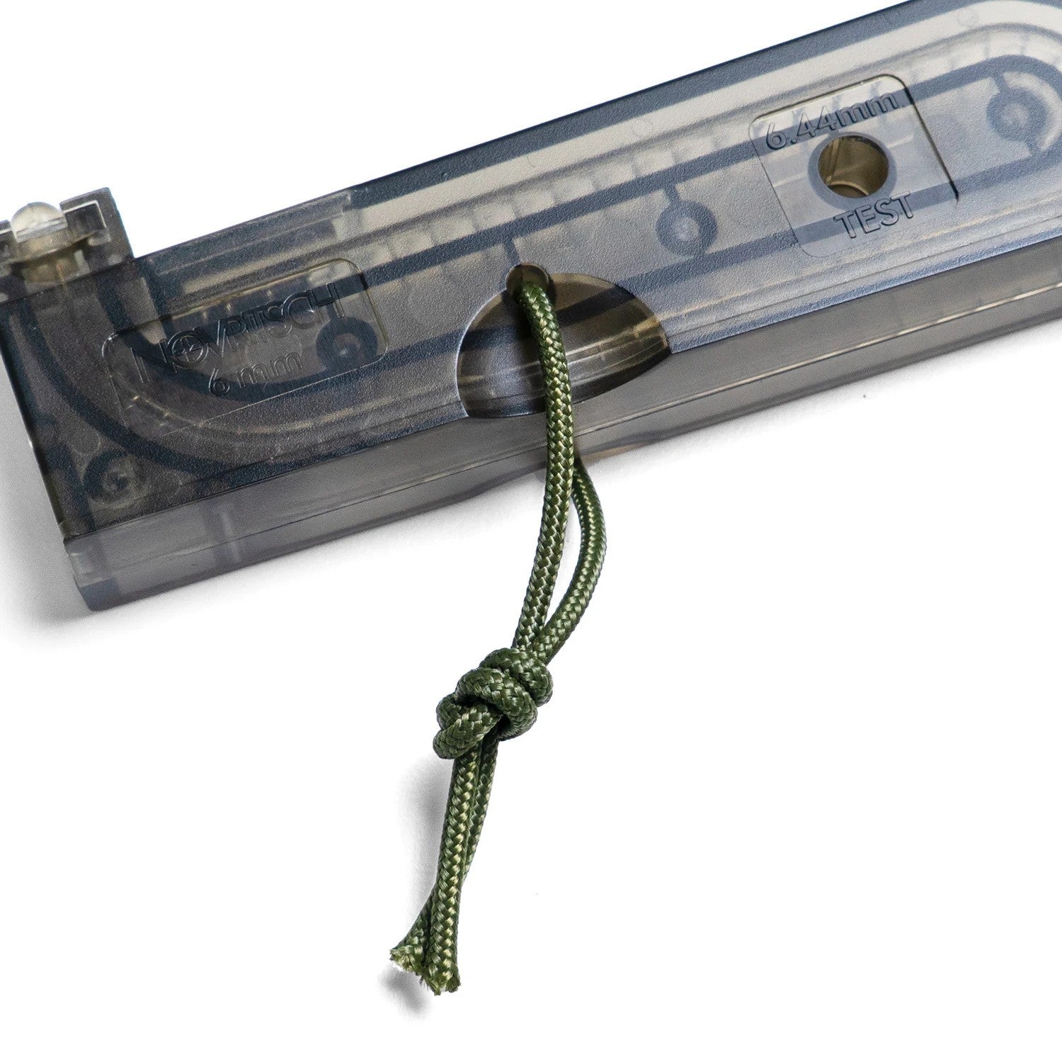 It includes an integrated BB tester so you can quickly check the BB size from your speedloader, preventing mistakes like loading 6mm BBs into your magazine. The magazine also has a small hole for an optional string, which can make it easier to pull out during use.